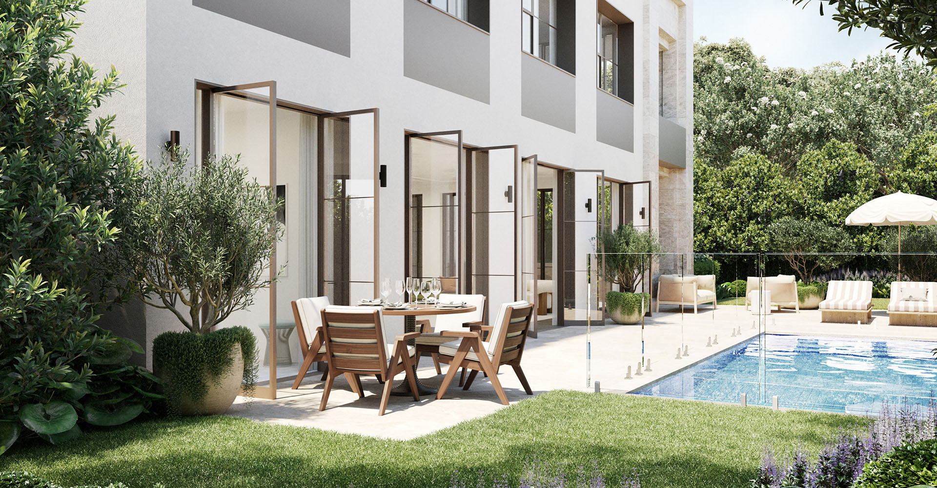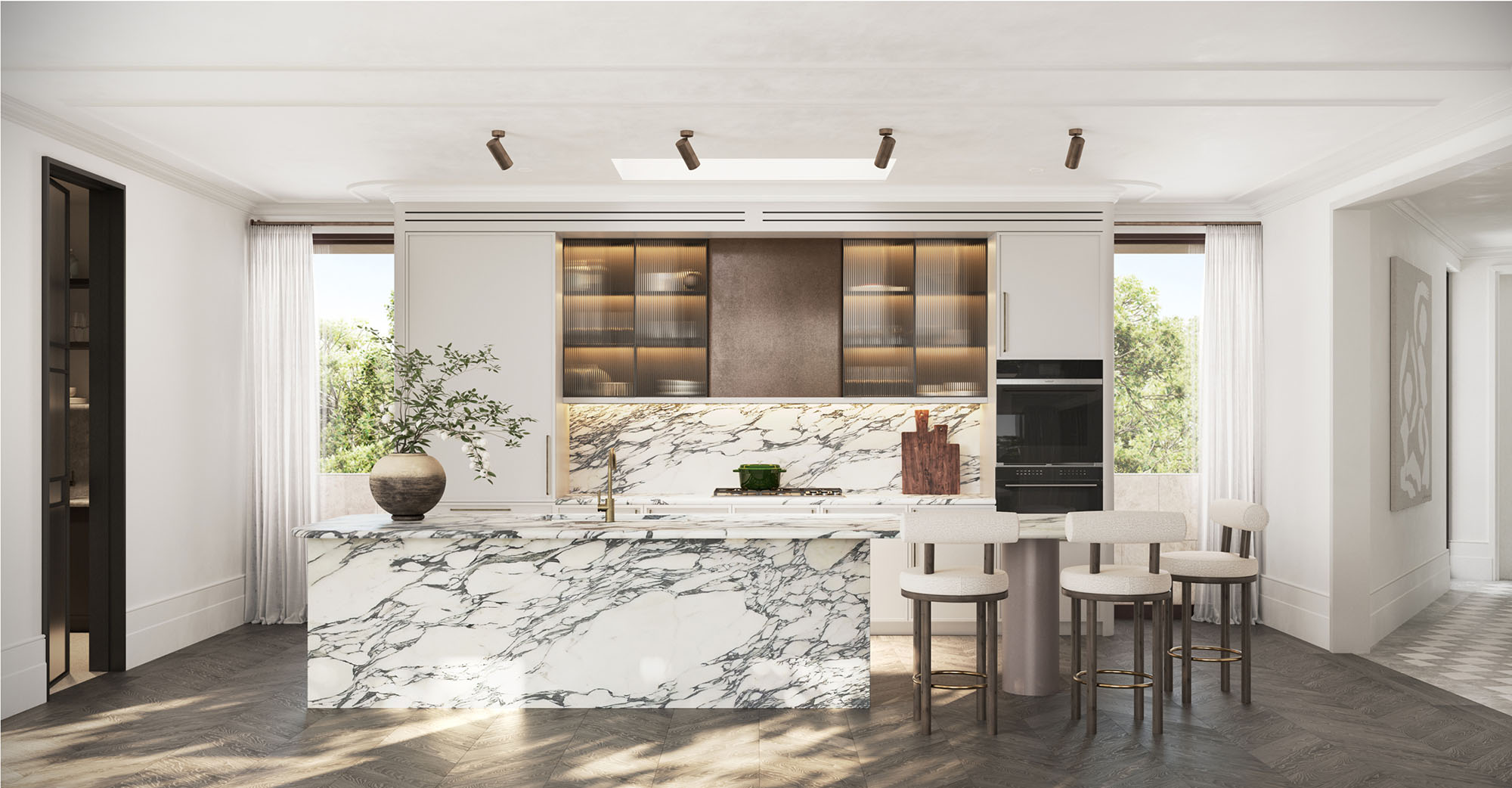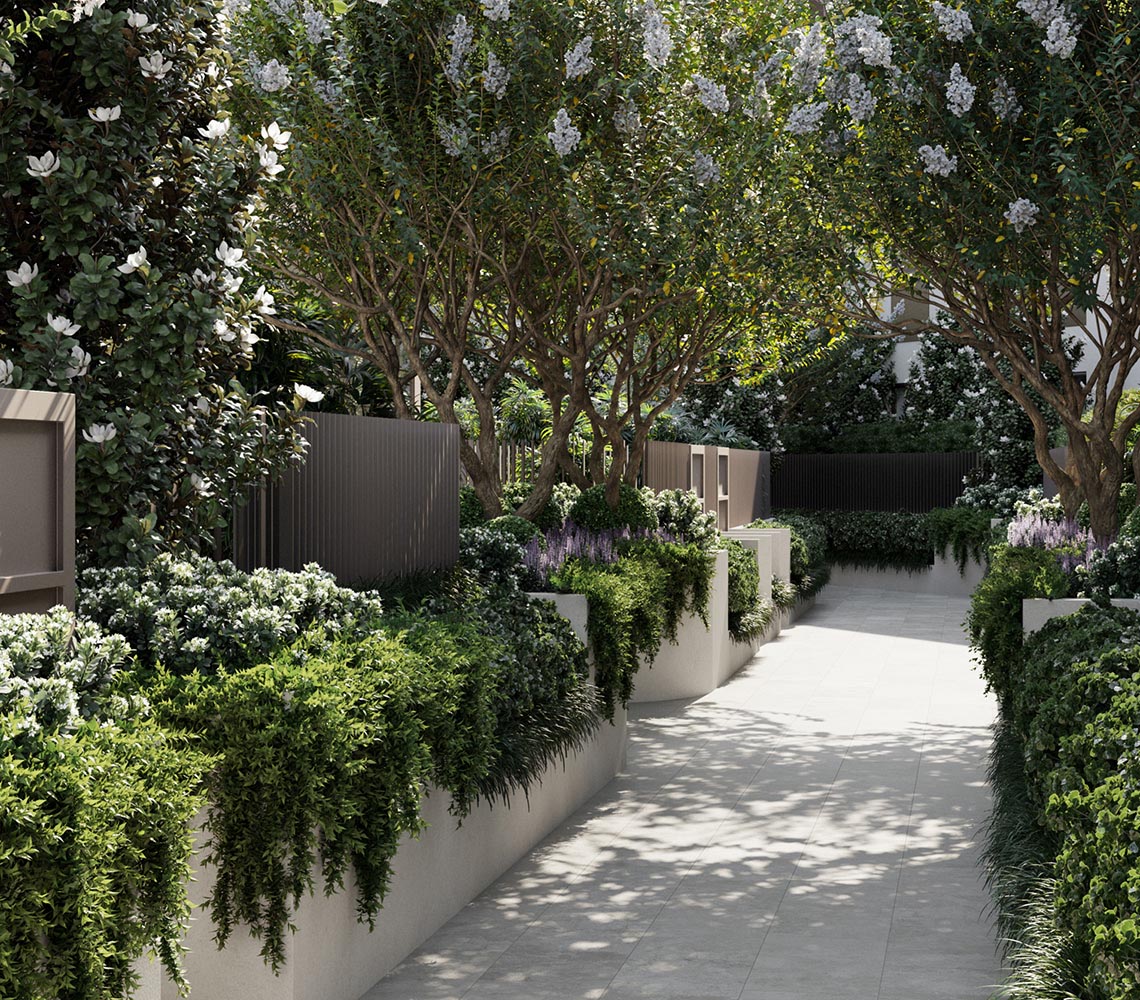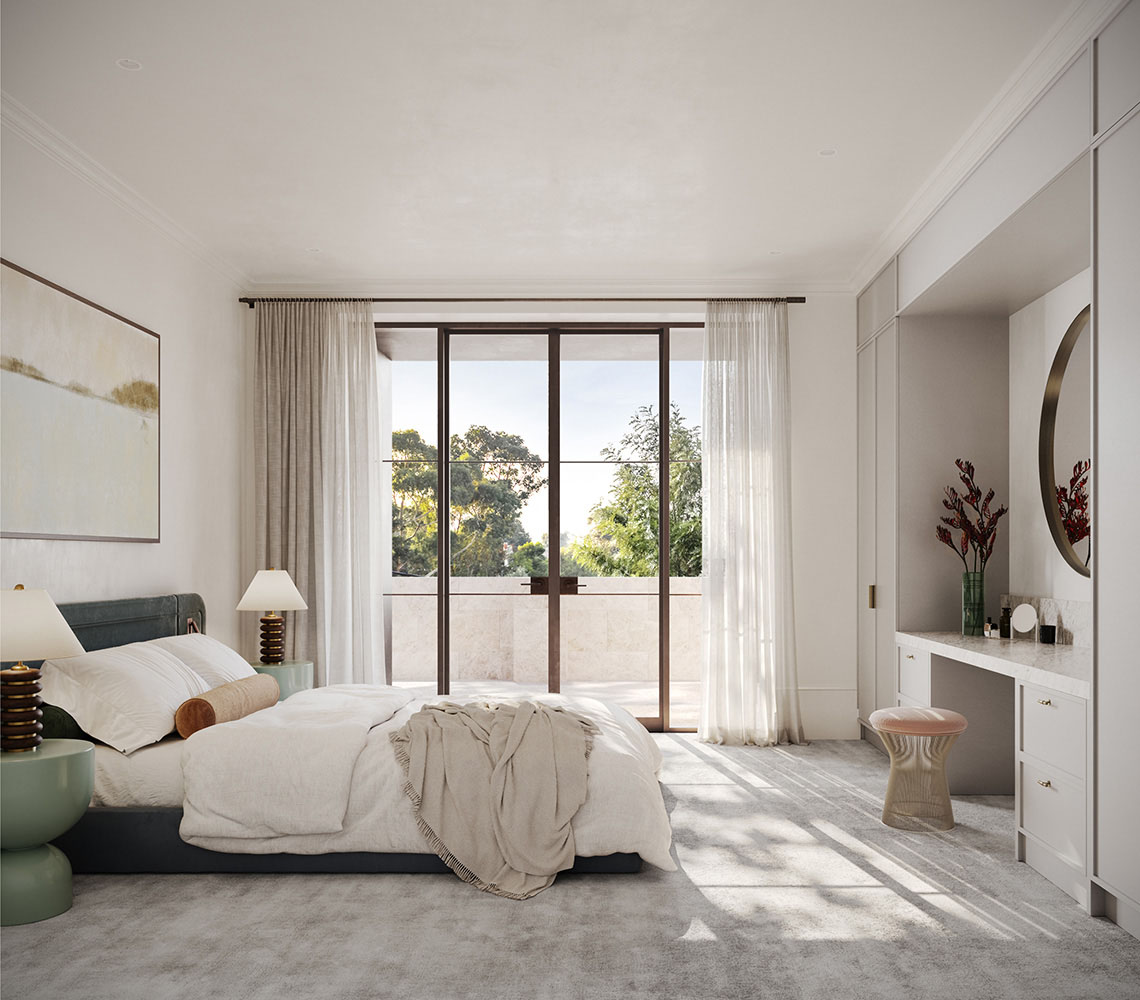 Residents can expect a luxuriously curated palette of texture, material, and light in their environment and enjoy the surrounding context with Woollahra's leafy streets. The apartments feature beautifully detailed, elegant living spaces with grand proportions, elevated ceiling heights, and tall contemporary French-style doors that connect each living space to tranquil terraces and greenery.